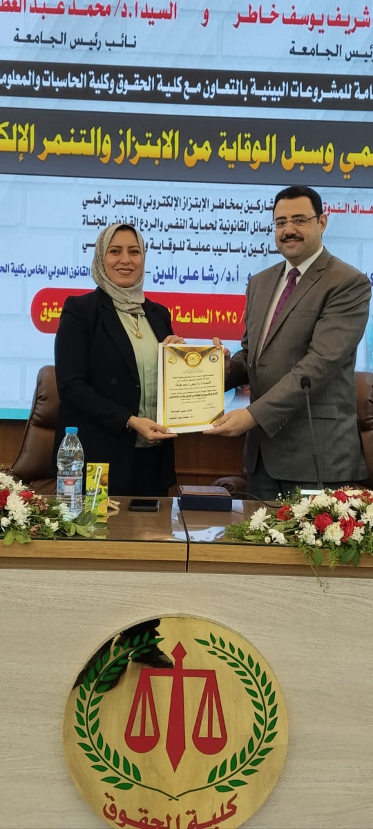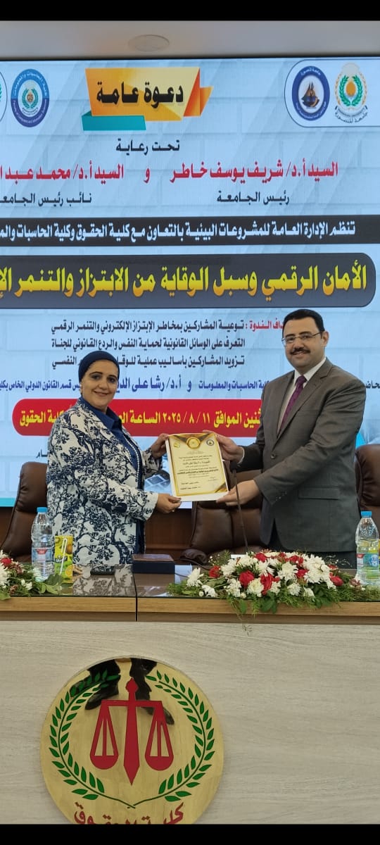 Afterwards, Prof. Dr. Rasha Al-Din — Professor and Head of the Department of Private International Law at the Faculty of Law — delivered a lecture titled “Towards Safe Internet Use”, where she discussed the legislative framework of Egyptian law, the laws combating cybercrimes, the Penal Code, telecommunications regulations, and data protection laws. She also addressed the most prominent types of cybercrimes and the legal protection mechanisms against electronic blackmail and cyberbullying.