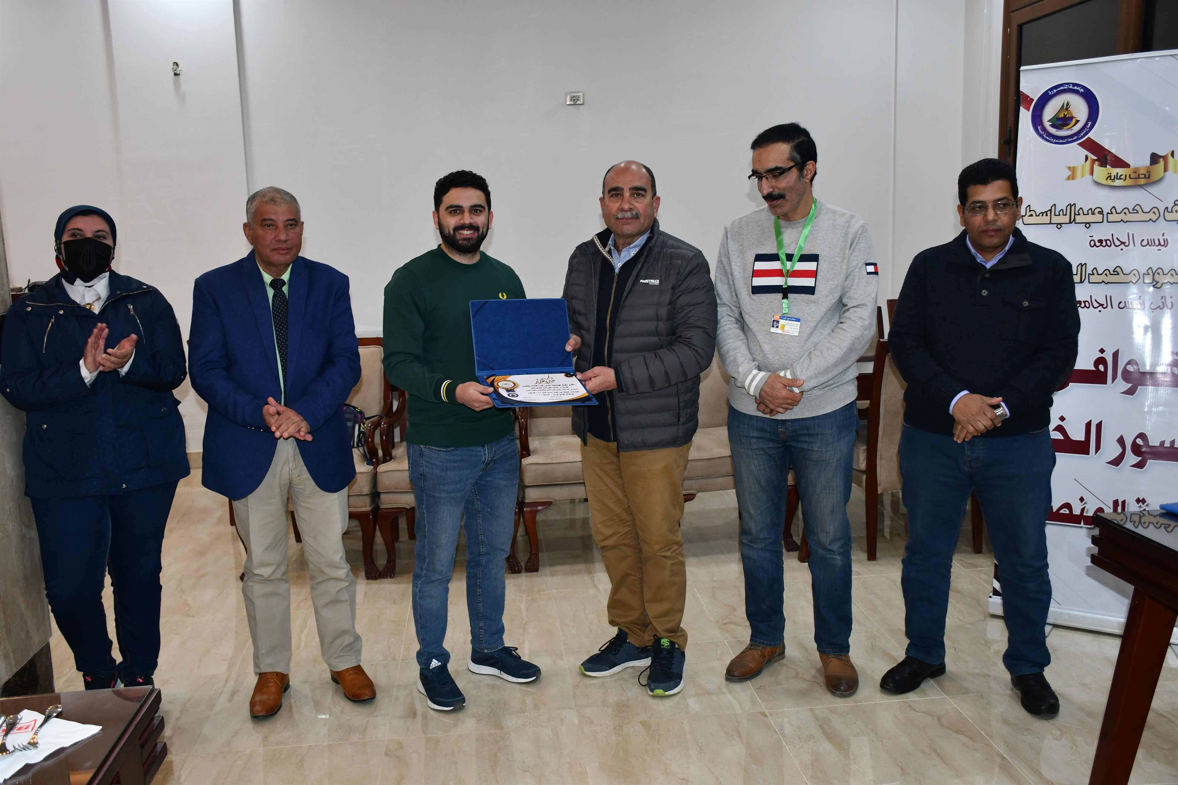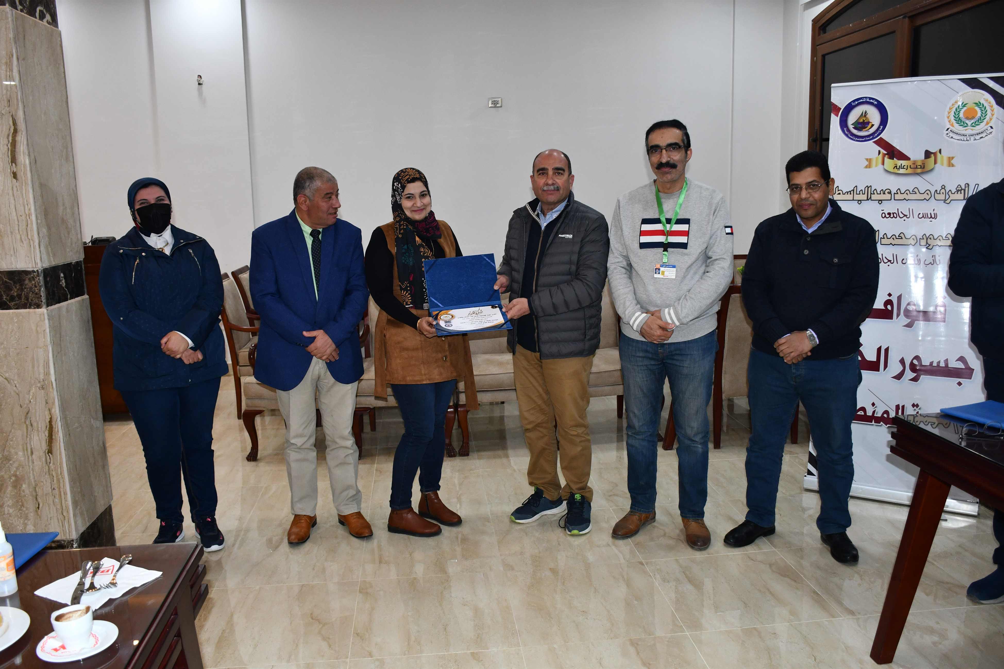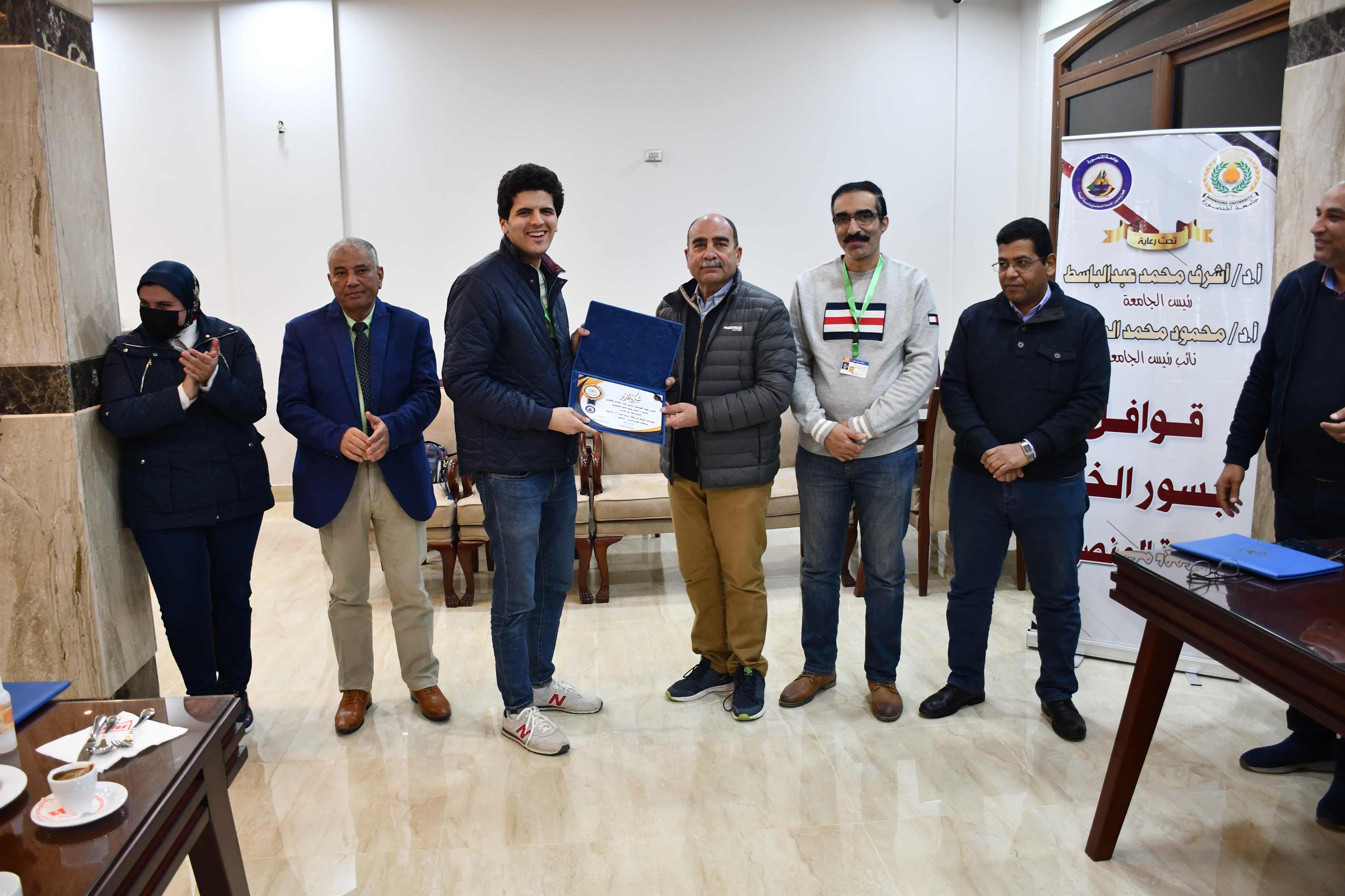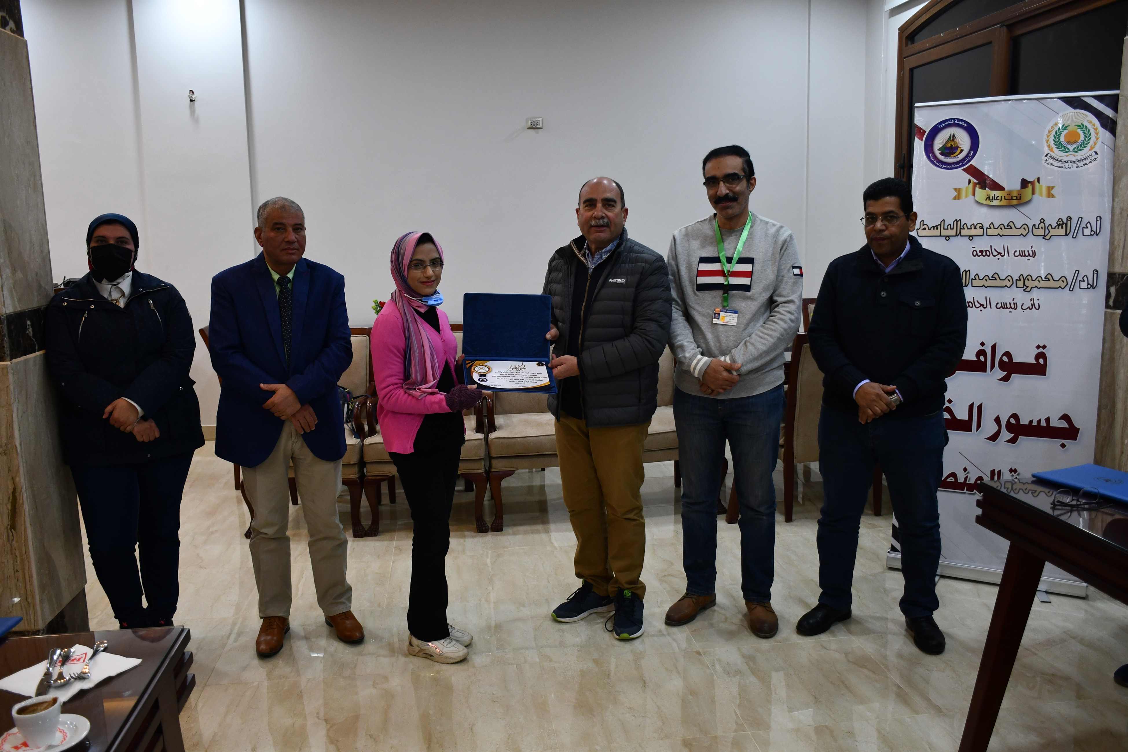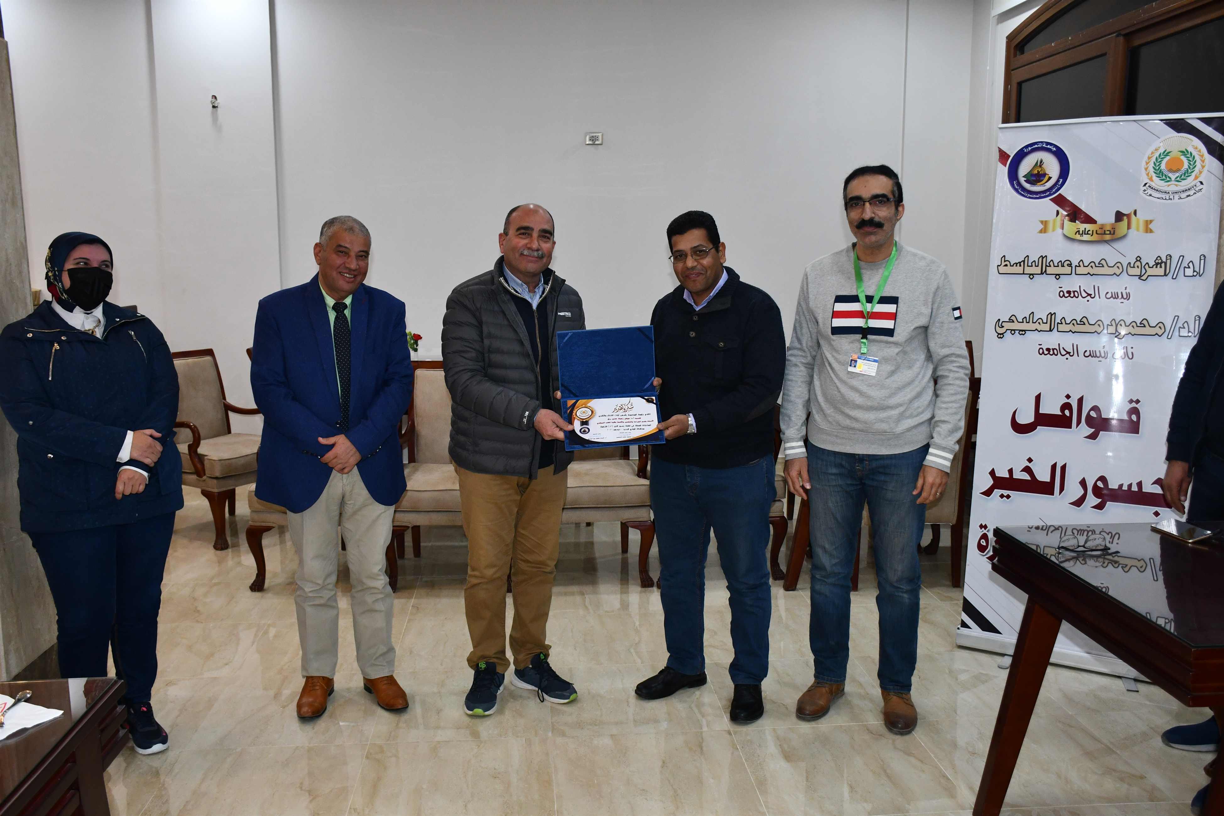 قام السيد أ.د/ محمود المليجي بتكريم السادة أعضاء القافلة من فريق الطب البشري والطب البيطري والصيادلة وفريق مركز رعاية وتنمية الطفولة والإداريين نظراً لما قدموه من جهود عظيمة ساهمت في نجاح فعاليات القافلة، والمكون من السادة التالي أسمائهم: -