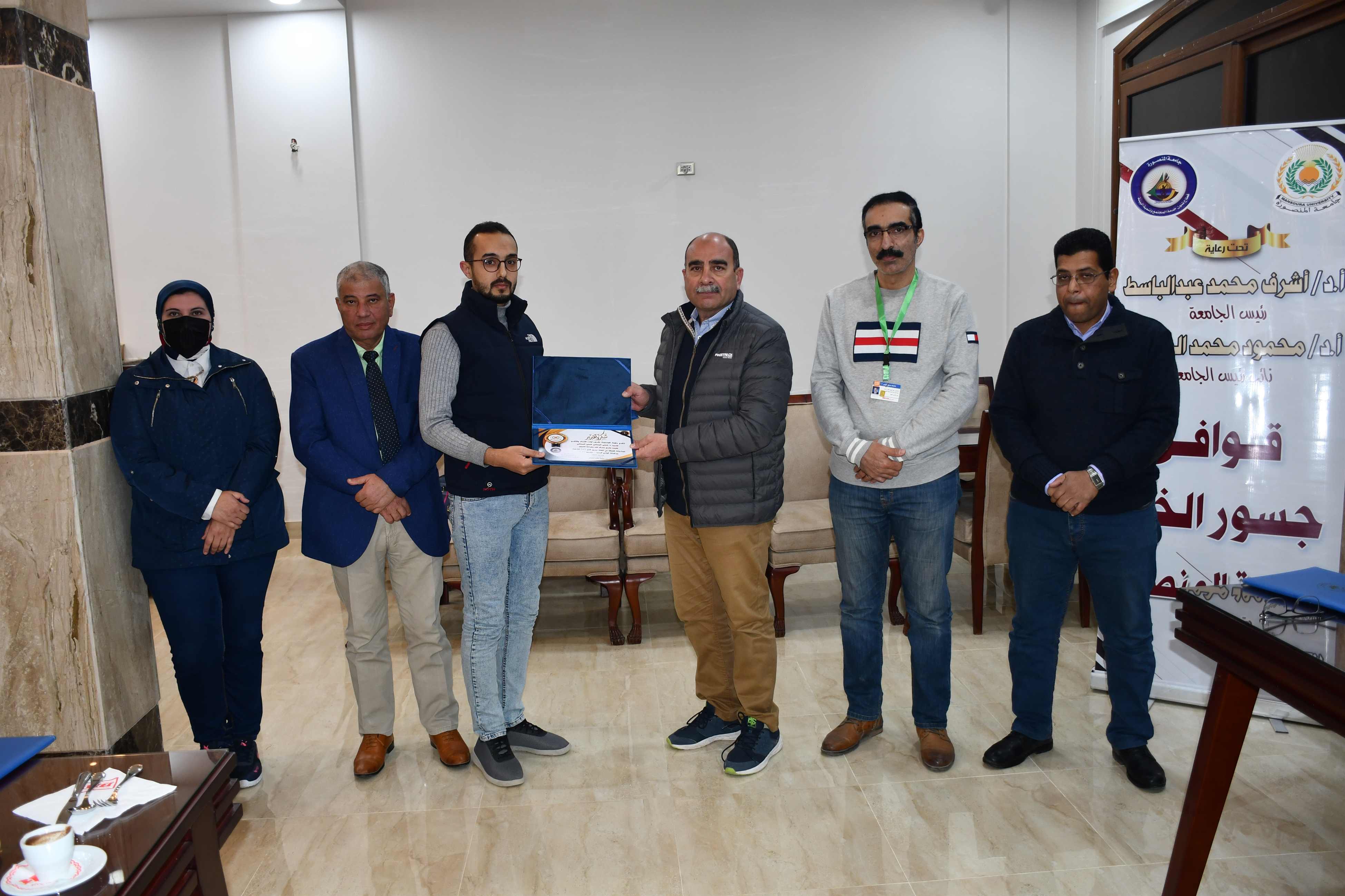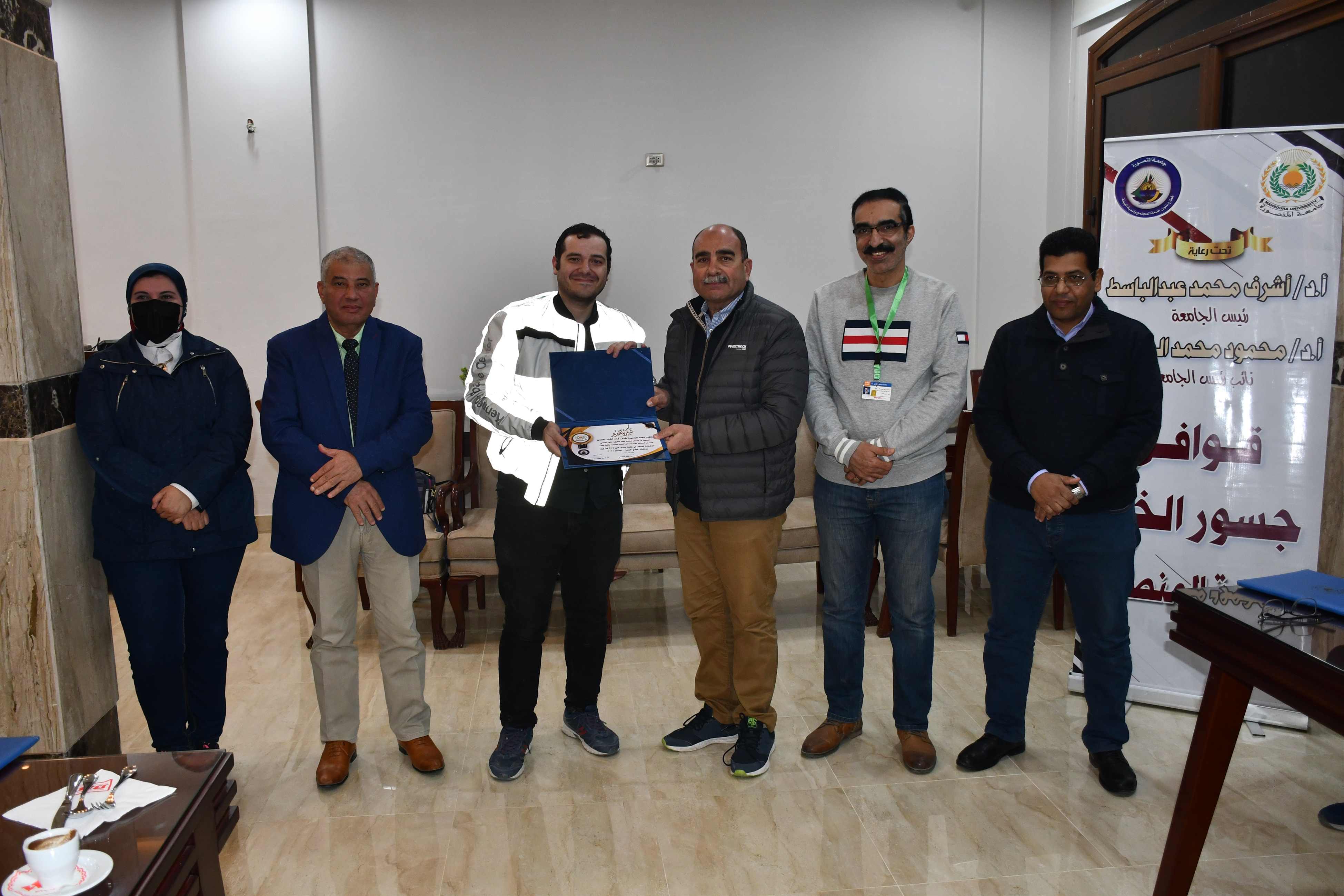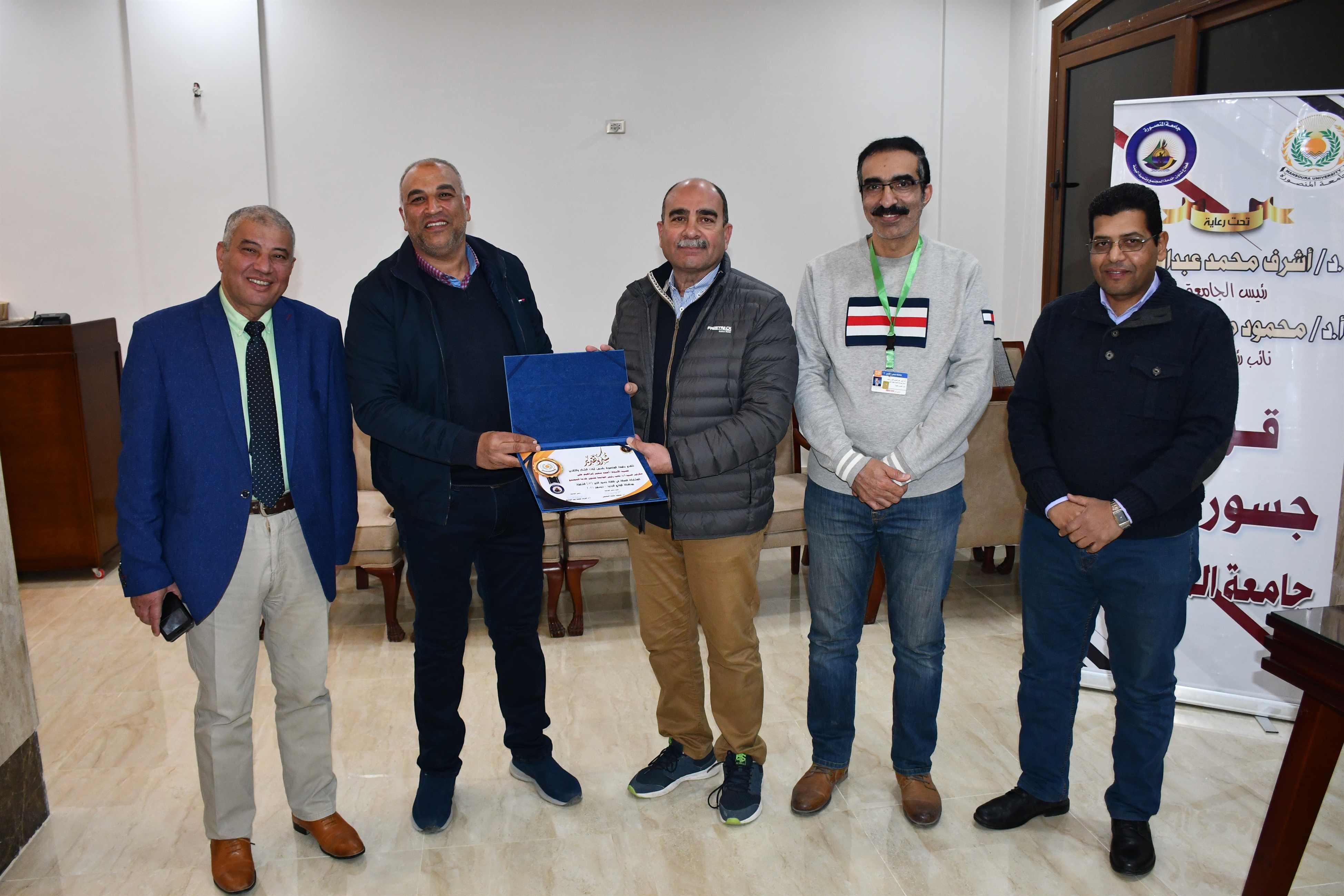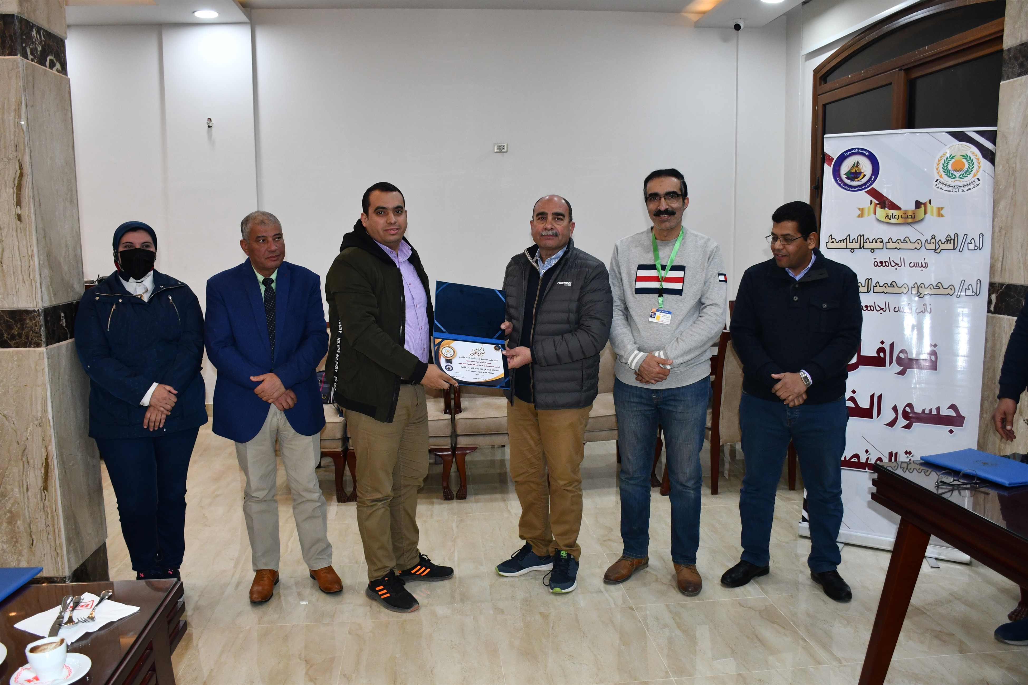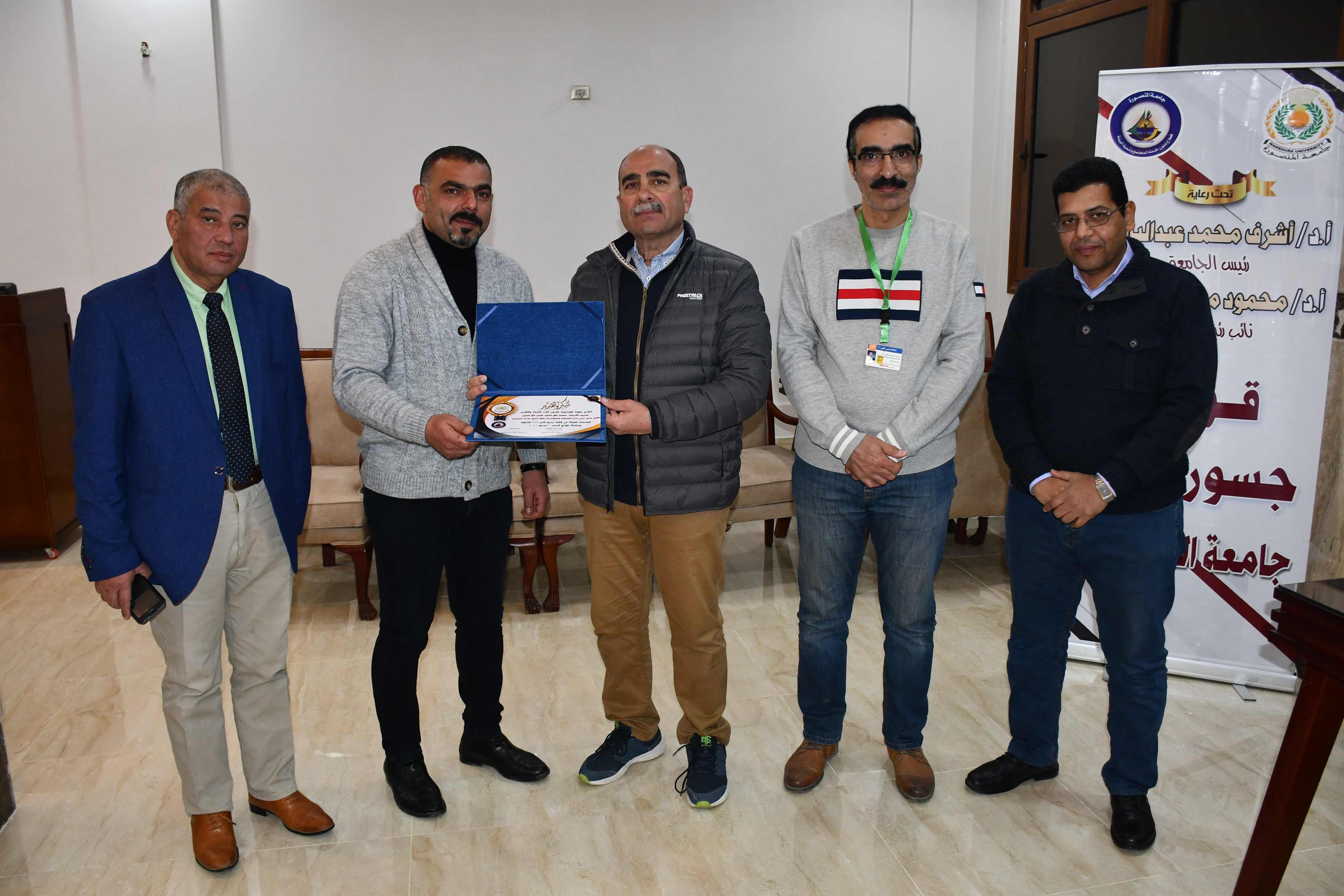 قام السيد أ.د/ محمود المليجي بتكريم السادة أعضاء القافلة من فريق الطب البشري والطب البيطري والصيادلة وفريق مركز رعاية وتنمية الطفولة والإداريين نظراً لما قدموه من جهود عظيمة ساهمت في نجاح فعاليات القافلة، والمكون من السادة التالي أسمائهم: -
