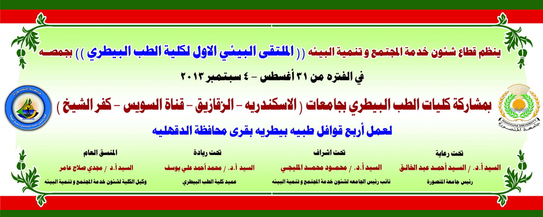 الملتقي البيئي الأول لكلية الطب البيطرى (ملتقى القوافل البيطرية )بمعسكر جامعة المنصورة بمدينة جمصه و التي تنظمه كلية الطب البيطري بالاشتراك مع (4) جامعات ( الإسكندرية – الزقازيق – قناة السويس – كفر الشيخ ) لعمل عدد (4) قوافل طبية بيطرية لقري محافظة الدقهلية في الفترة منة 31/8 حتى 4/9/2013 على النحو التالي:-