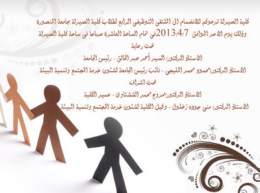 تتشرف كلية الصيدلة جامعة المنصورة بدعوتكم لحضور الملتقى التوظيفى الرابع لطلاب كلية الصيدلة جامعة المنصورة وذلك يوم الاحد الموافق 2013/4/7 فى تمام الساعة العاشرة صباحا فى ساحة كلية الصيدلة تحت رعاية السيد الاستاذ الدكتور/السيد أحمد عبد الخالق - رئيس الجامعة والسيد الاستاذ الدكتور/ محمود محمد المليجى - نائب رئيس الجامعة لشئون خدمة المجتمع وتنمية البيئة وتحت اشراف السيد الاستاذ الدكتور/ ممدوح محمد الششتاوى - عميد كلية الصيدلة والاستاذ الدكتور/منى جوده زغلول - وكيل الكلية لشئون خدمة المجتمع وتنمية البيئة.